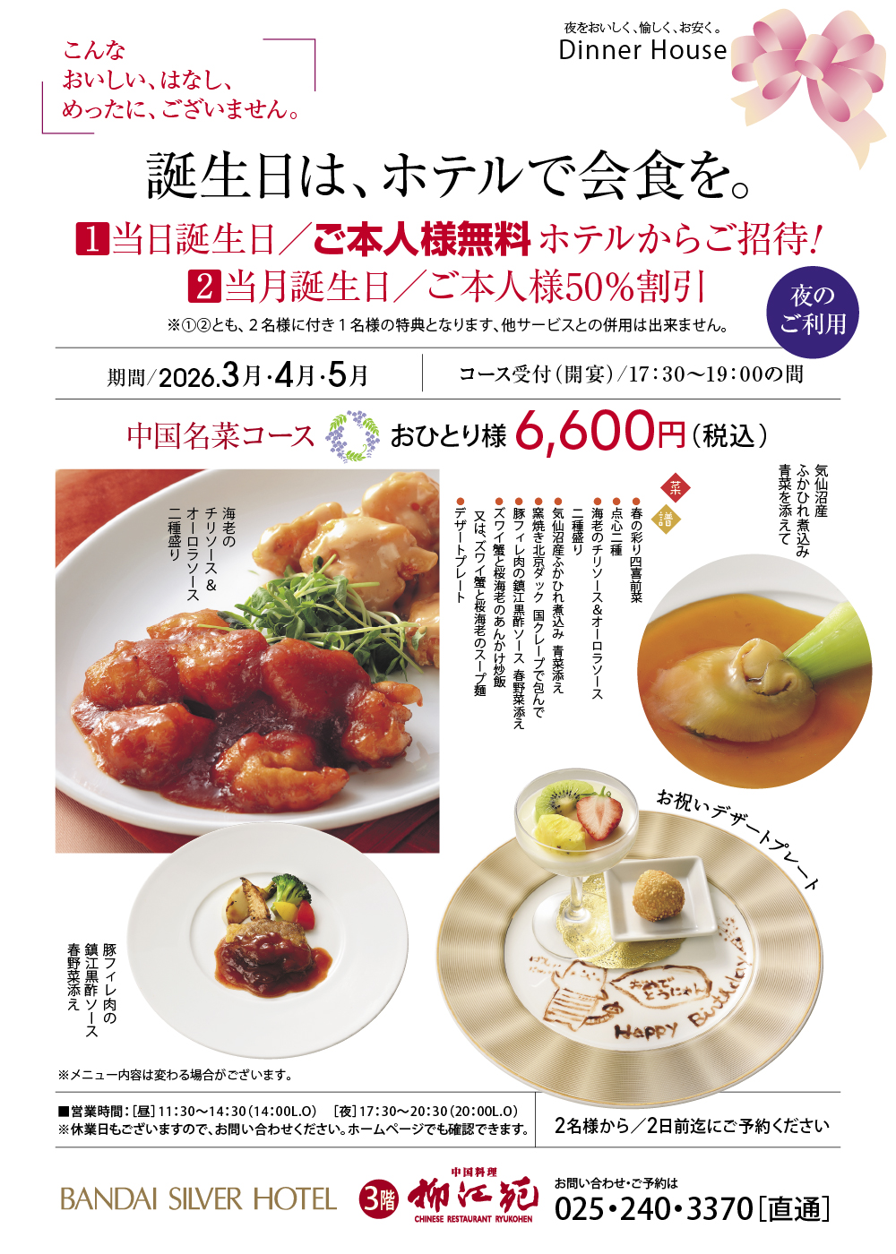 ■2026年3月・4月・5月 コース受付(開宴)/17:30~19:00の間 夜のご利用